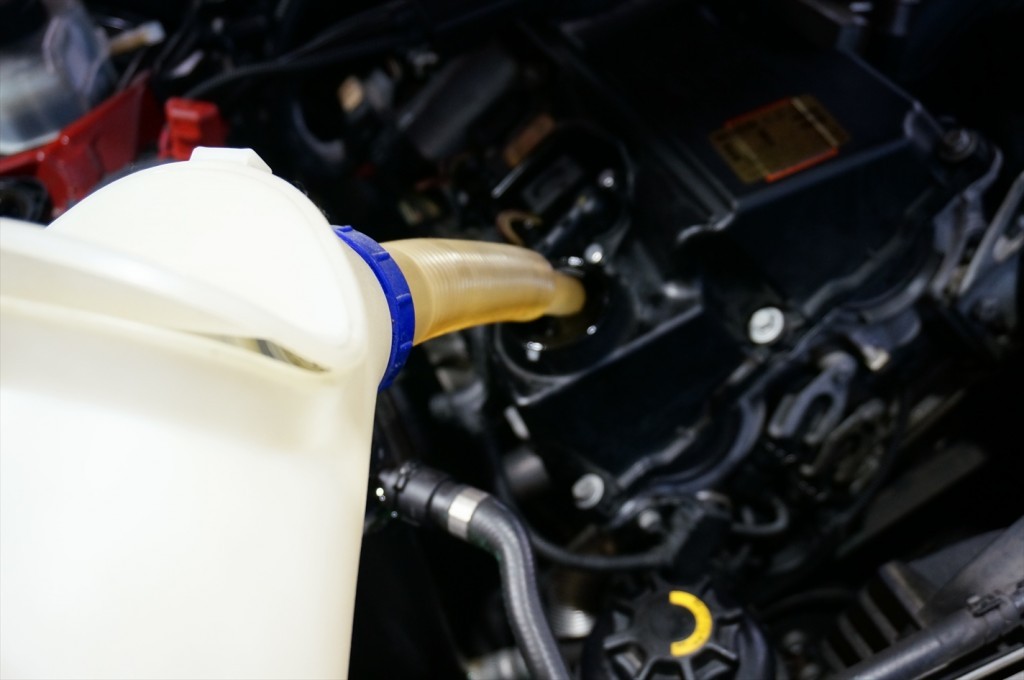 古いオイルを排出後、規定量のエンジンオイルを注入してオイル交換の作業は終了です。