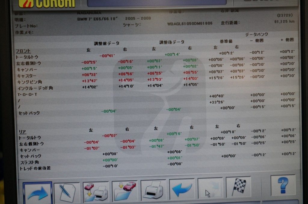 ブッシュ類の各パーツを交換後に4輪アライメントの測定と調整を実施。