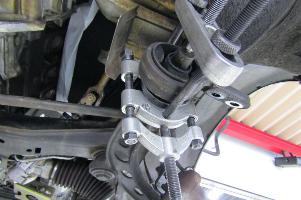 再びSSTを使用して斜めに入らない様に注意しながらロアアームへ装着してロアコンブッシュの交換が完了。