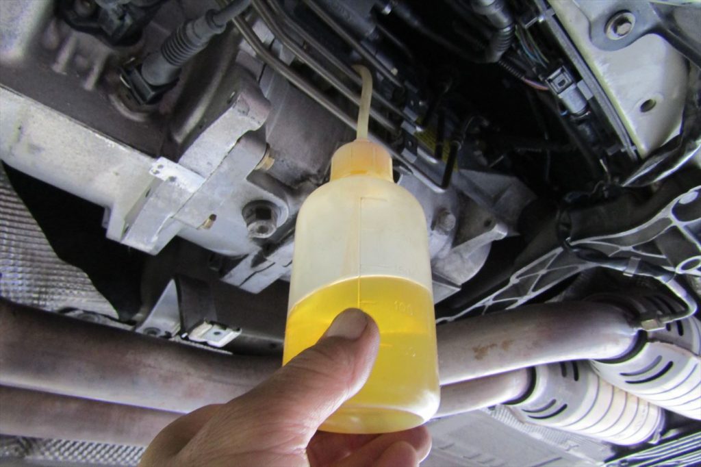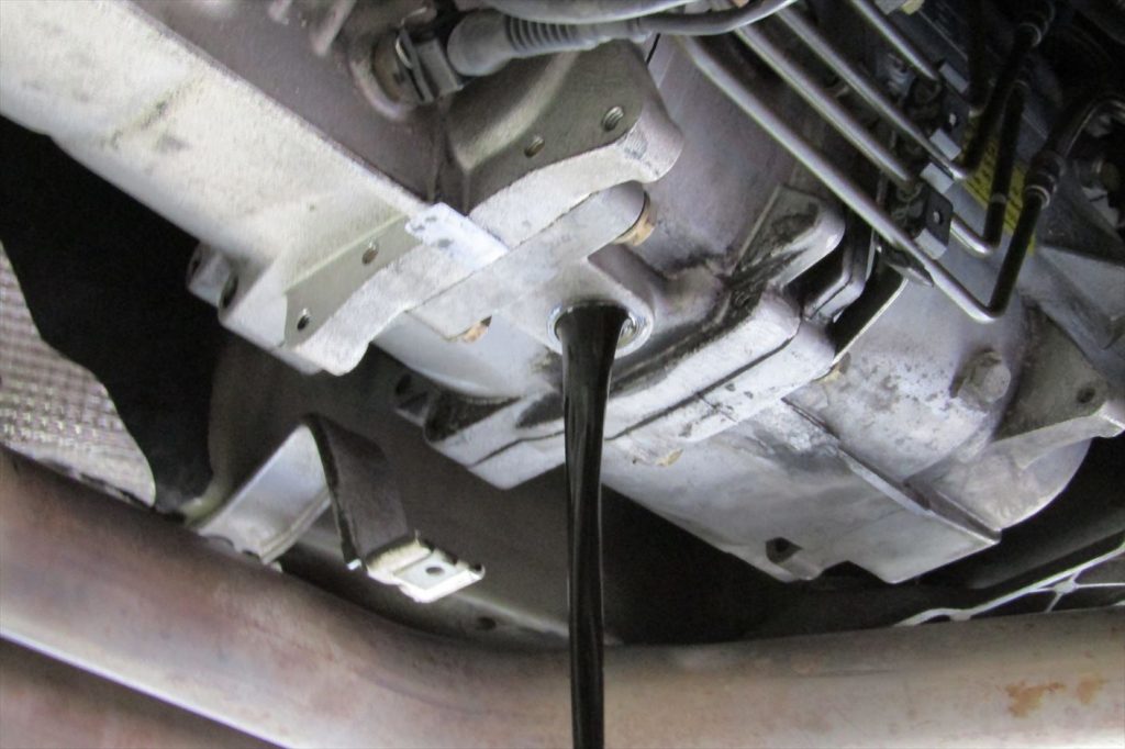 交換の前にフラッシング剤を注入し内部のスラッジを落とし古いオイルと同時に排出します。
