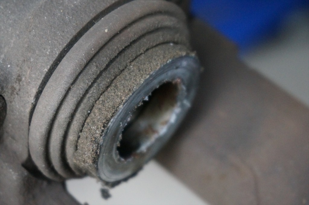 キャリパーピストンの周囲に削れたブレーキダストが堆積しているのが分かりますね。