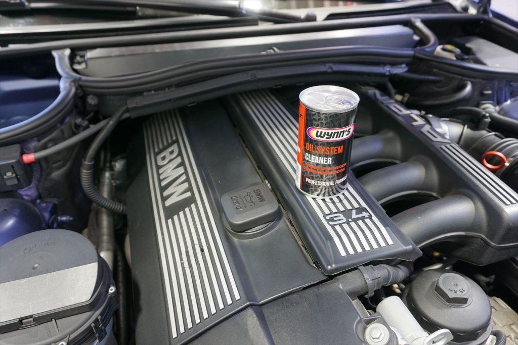 交換の前にフラッシング剤を注入してエンジン内部で発生したスラッジやカーボンの汚れを落とし易くします。