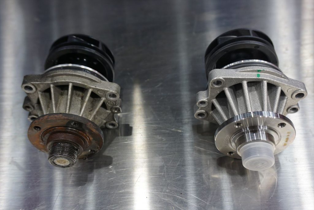 こちらも漏れ出すと一気に噴き出す事があるので要注意。ウォーターポンプを取り外し、オイルストーンで装着面に残ったガスケット跡を落として表面を綺麗に整えておきます。新旧のウォーターポンプ。