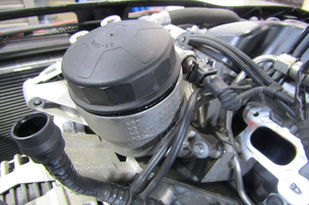 新しいオイルエレメントを装着し、規定量のエンジンオイルを注入してエンジンオイル交換が完了。