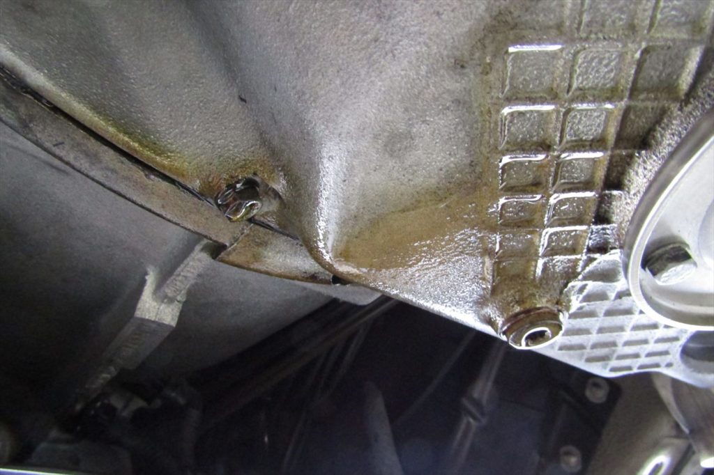 オイル漏れの状態を見てみると…エンジンとミッションの継ぎ目付近にオイル溜まりが出来ていました。