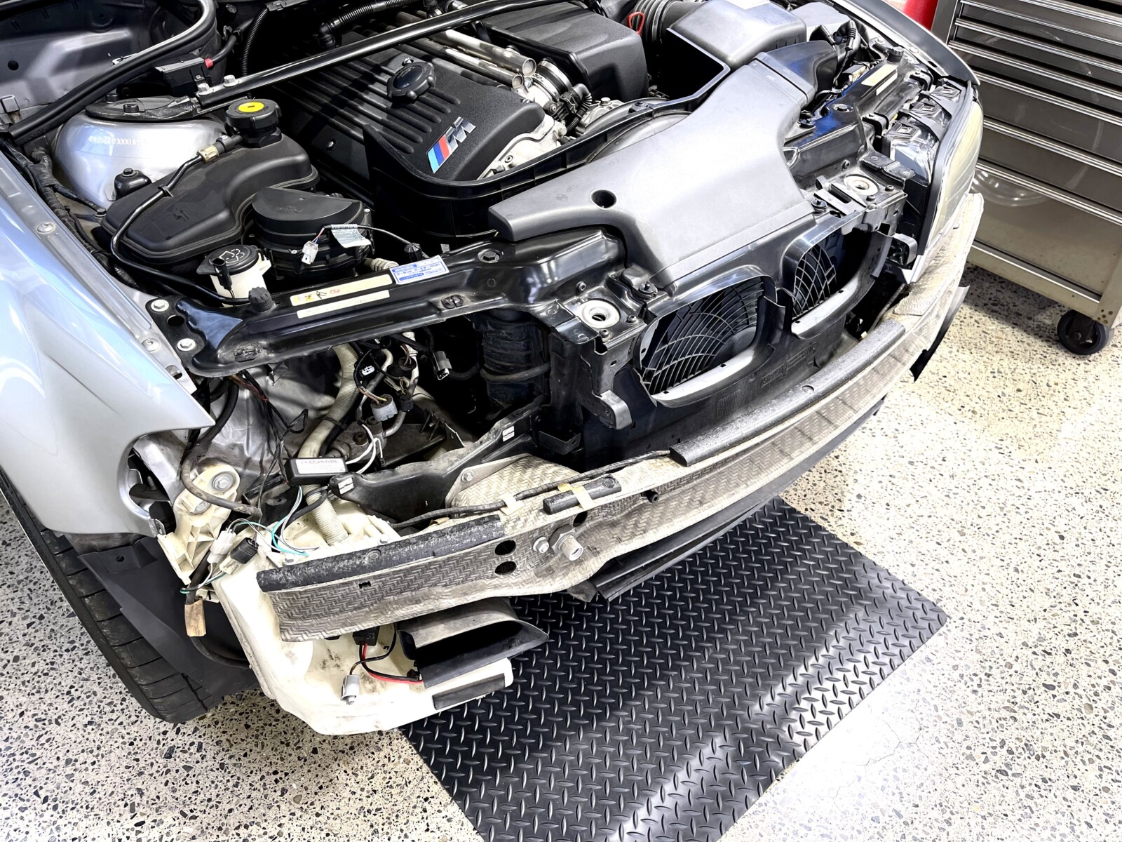 バンパー下部のインナーカバー取付部分が破損していたので、主に樹脂部品を交換しバンパーの位置調整なども行います。